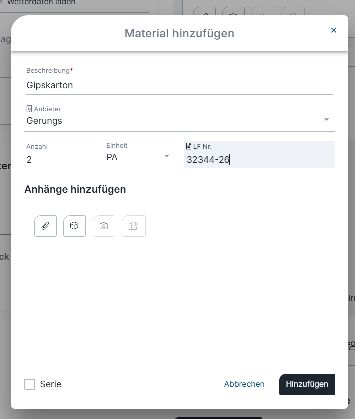 zu jeder Firma kann auch Material und Lieferscheine hinzugefügt werden. Über die Foto-Funktion können Sie den Lieferschein fotografieren, oder über das Quader-Symbol aus bestehenden Datei ein auswählen.