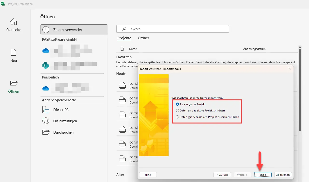 3. Auswählen, wie Sie das Projekt importieren möchten (Als neues Projekt, zu einem bestehenden Projekt laden) und auf "Ende" drücken.
