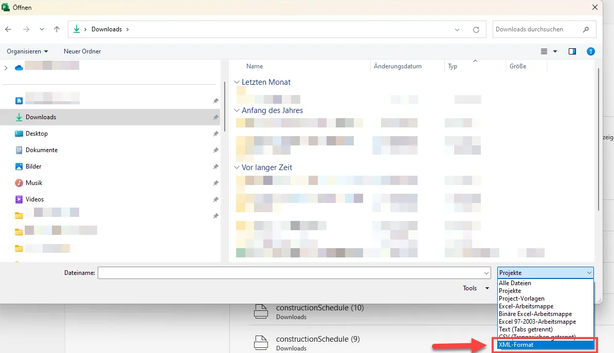 2. Im Explorer unten neben "Dateiname" XML-Format auswählen: