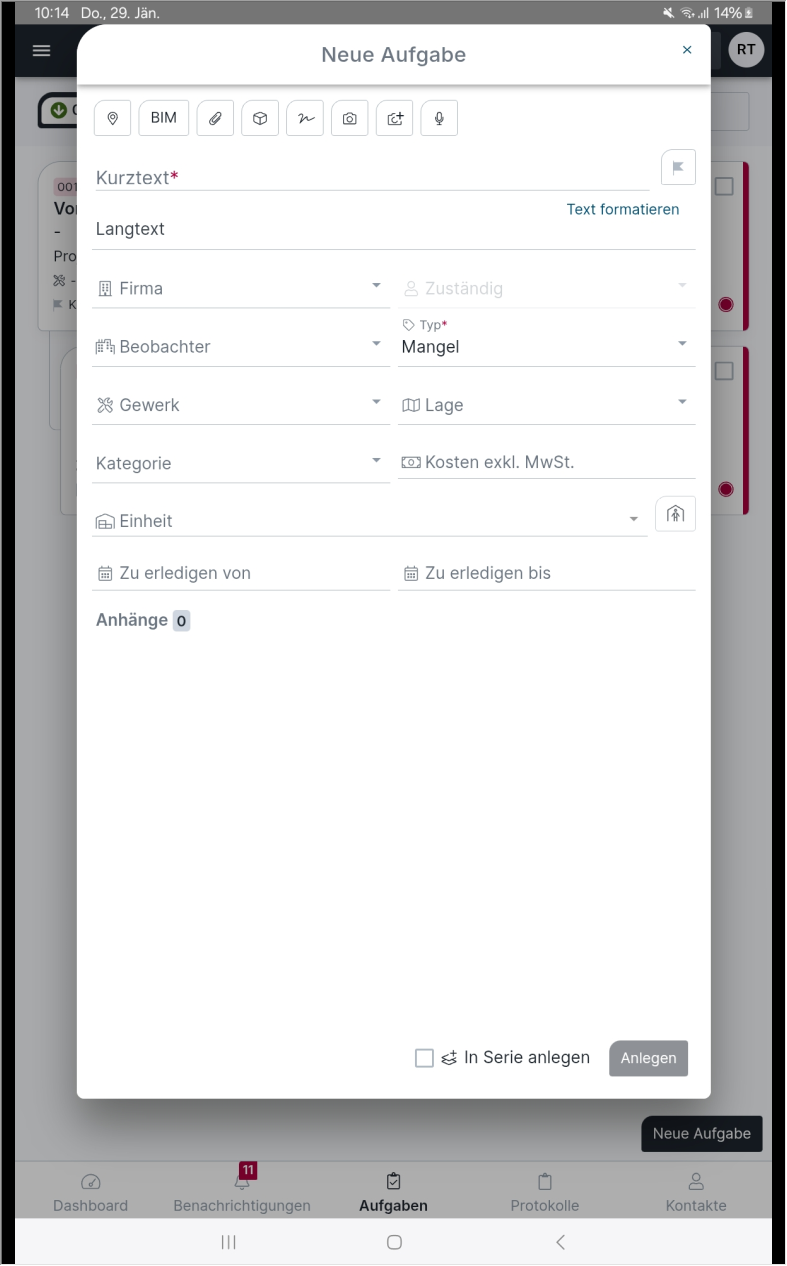 Es öffnet sich eine Eingabemaske, optimiert für die schnelle Eingabe auf der Baustelle und beschränkt auf wenige Felder. Folgende Informationen können Sie in der Kurzansicht eingeben: