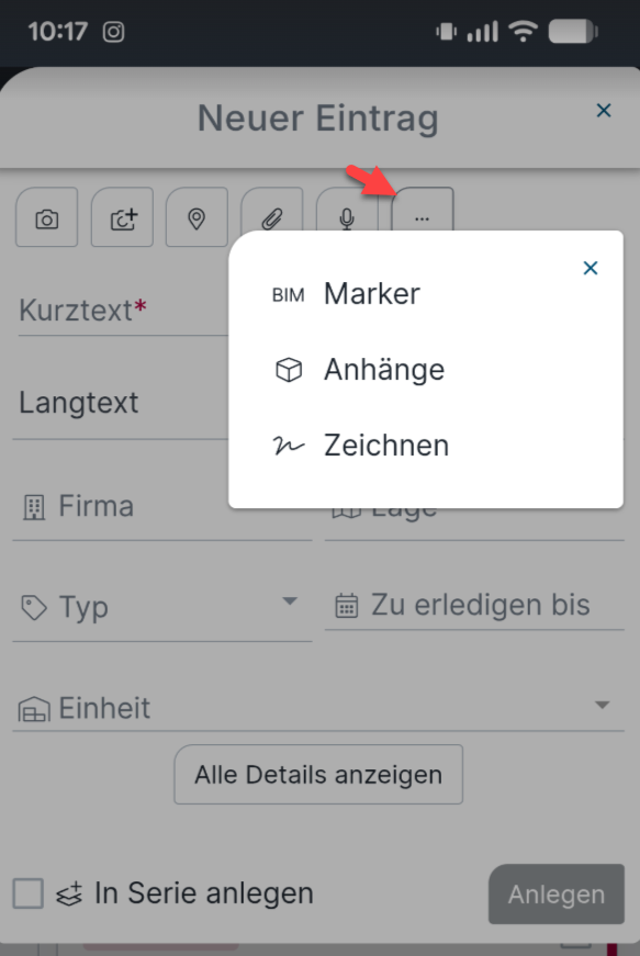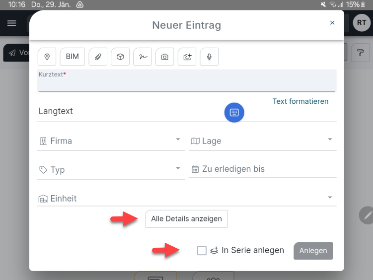 Möchten Sie die Einträge bereits auf der Baustelle detailliert ausfüllen, klappen Sie mit dem Pfeilsymbol die Kurzansicht auf. Nun haben Sie in der Detailansicht alle verfügbaren Felder zur Auswahl: