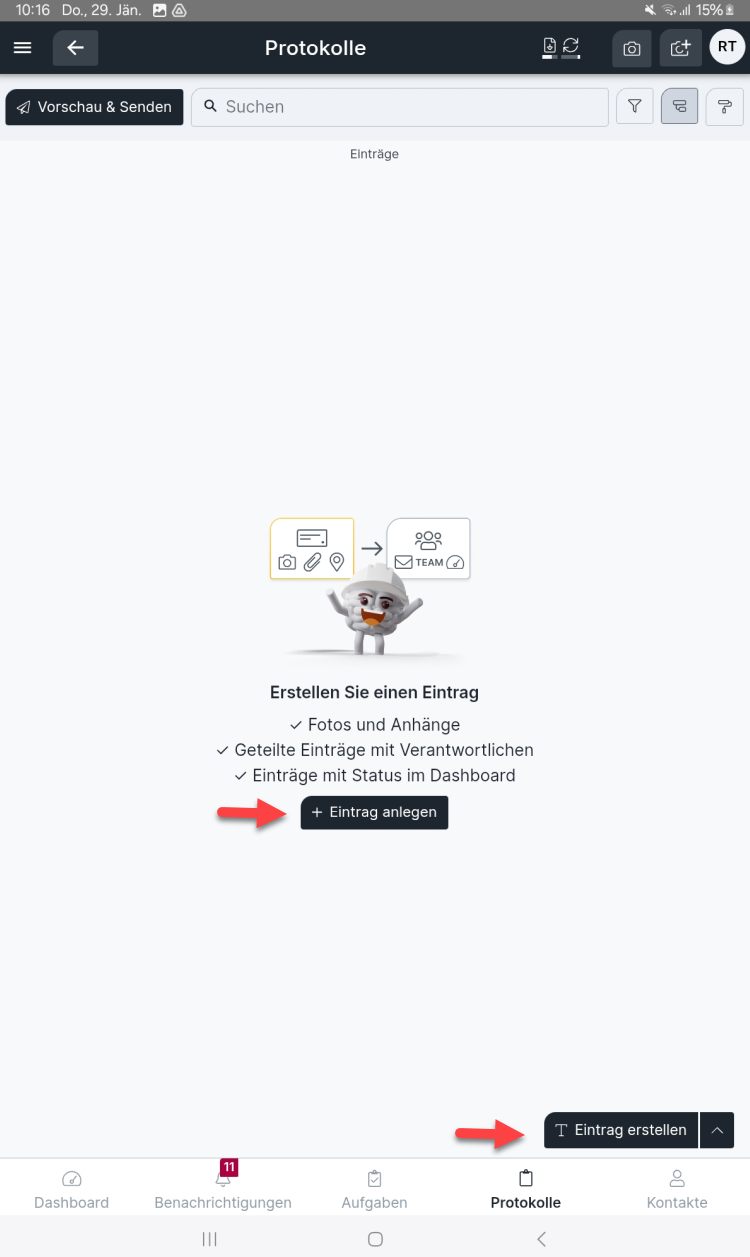 Haben Sie ein Protokoll angelegt, klicken Sie im Protokoll rechts unten auf Eintrag erstellen.