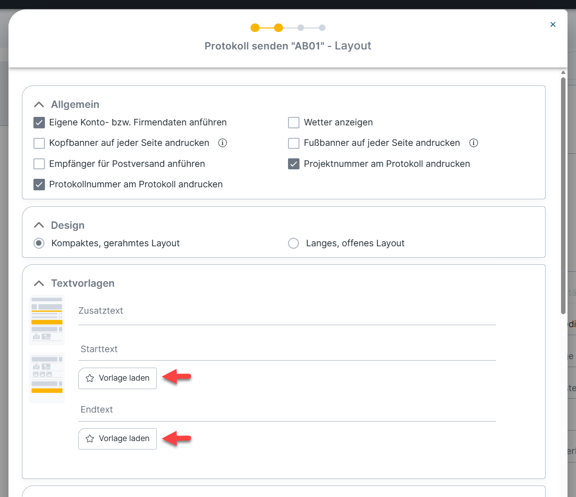 Für das Konfigurieren und Versenden von PDF-Protokollen können Textvorlagen für den Starttext und die Abschließende Informationen gespeichert und angewendet werden.