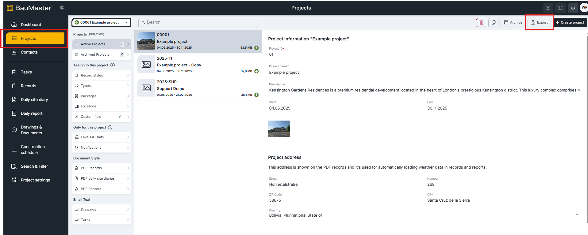 Using the "Export project" function, all reports, logs, attachments, plans, and photos can be exported or downloaded in a ZIP archive file.