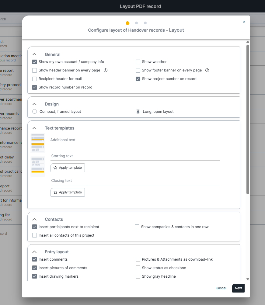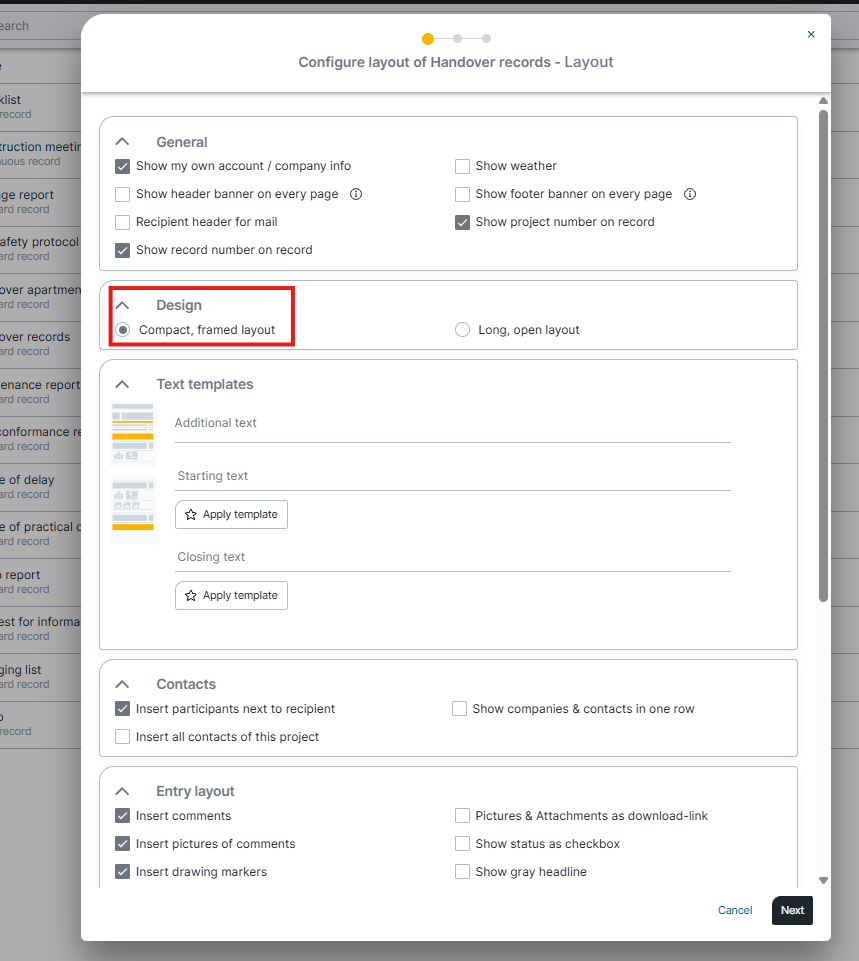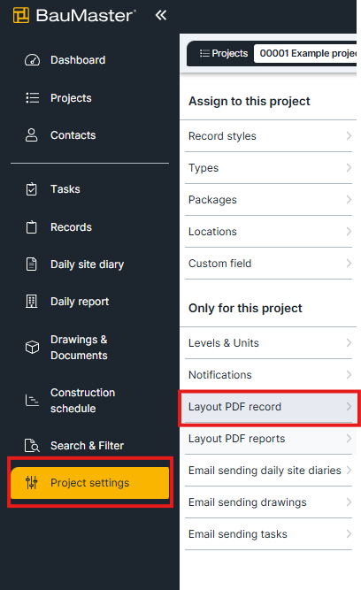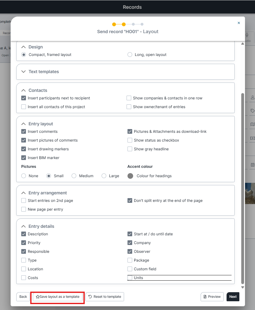 When using the "Save layout as template" action, the settings for this protocol type (e.g. meeting minutes or defect logs etc.) will be overwritten in the project settings.