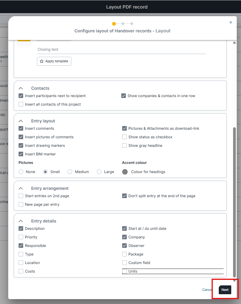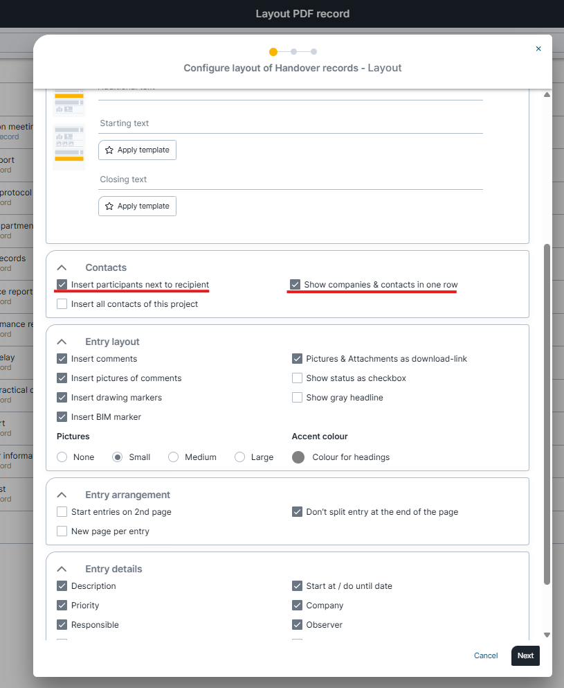 - Deselect the "Insert all project contacts" checkbox. Only the recipients and attendees will then be listed on the PDF, which considerably minimizes your contact list.
