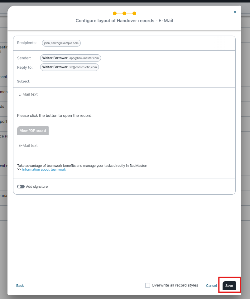 Click "Next" twice, set a default email text if necessary, and then click "Save". This way, all records of this type (e.g. meeting minutes) will be sent with these settings in the future.