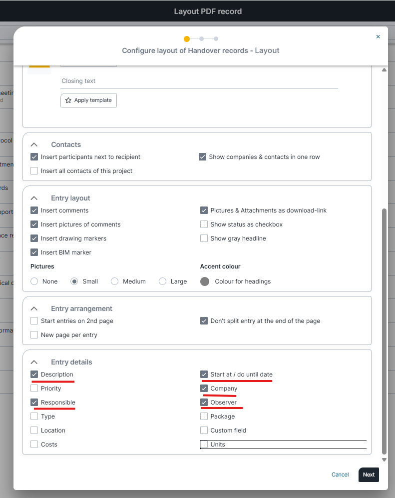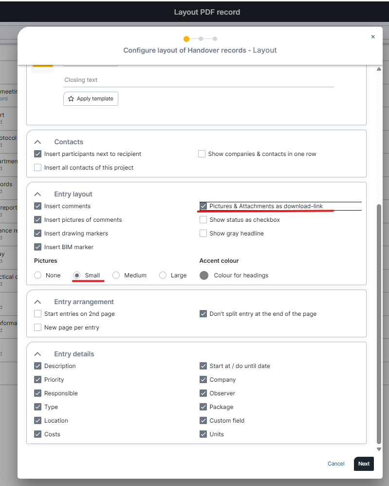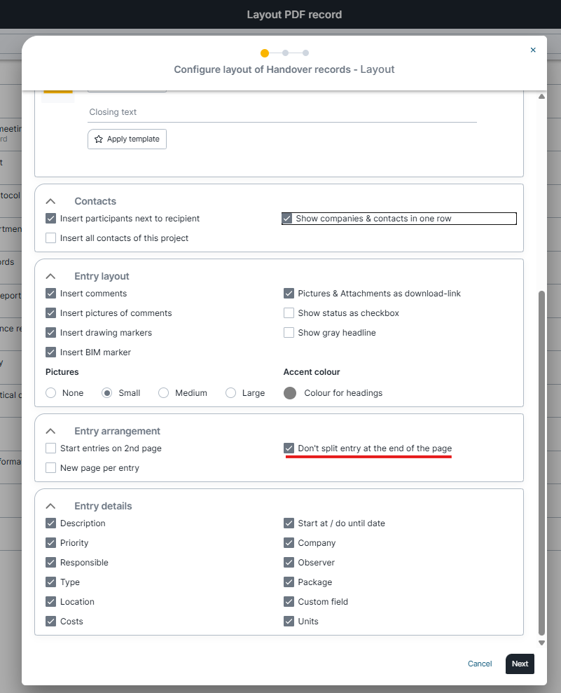 No matter what information you document in the protocol entries in BauMaster, you can simply hide it on the PDF document. Deselect all entry details that are not absolutely necessary on the PDF.